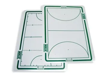 Magnetic whiteboard with dual-sided outdoor and indoor field hockey markings.